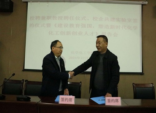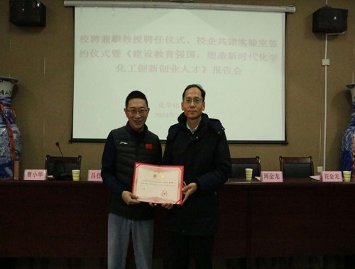 公司党委委员、副董事长王殿元代表学校向吕仕铭颁发聘书,正式聘任吕仕铭先生为公司兼职教授。随后,双方共同签署共建“能源再生循环”联合实验室协议和技术合同,并为校企联合实验室进行揭牌。
